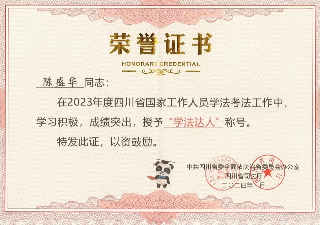 近日,中共四川省委全面依法治省委員會辦公室、四川省司法廳通報2023年度四川省國家工作人員學法考法工作情況,全省114.8萬人參考,評出學法超過1000分且年度考法成績滿分的“學法達人”共1143名,其中建設公司陳盛華同志以位列全省企業類第3名的成績喜獲殊榮。