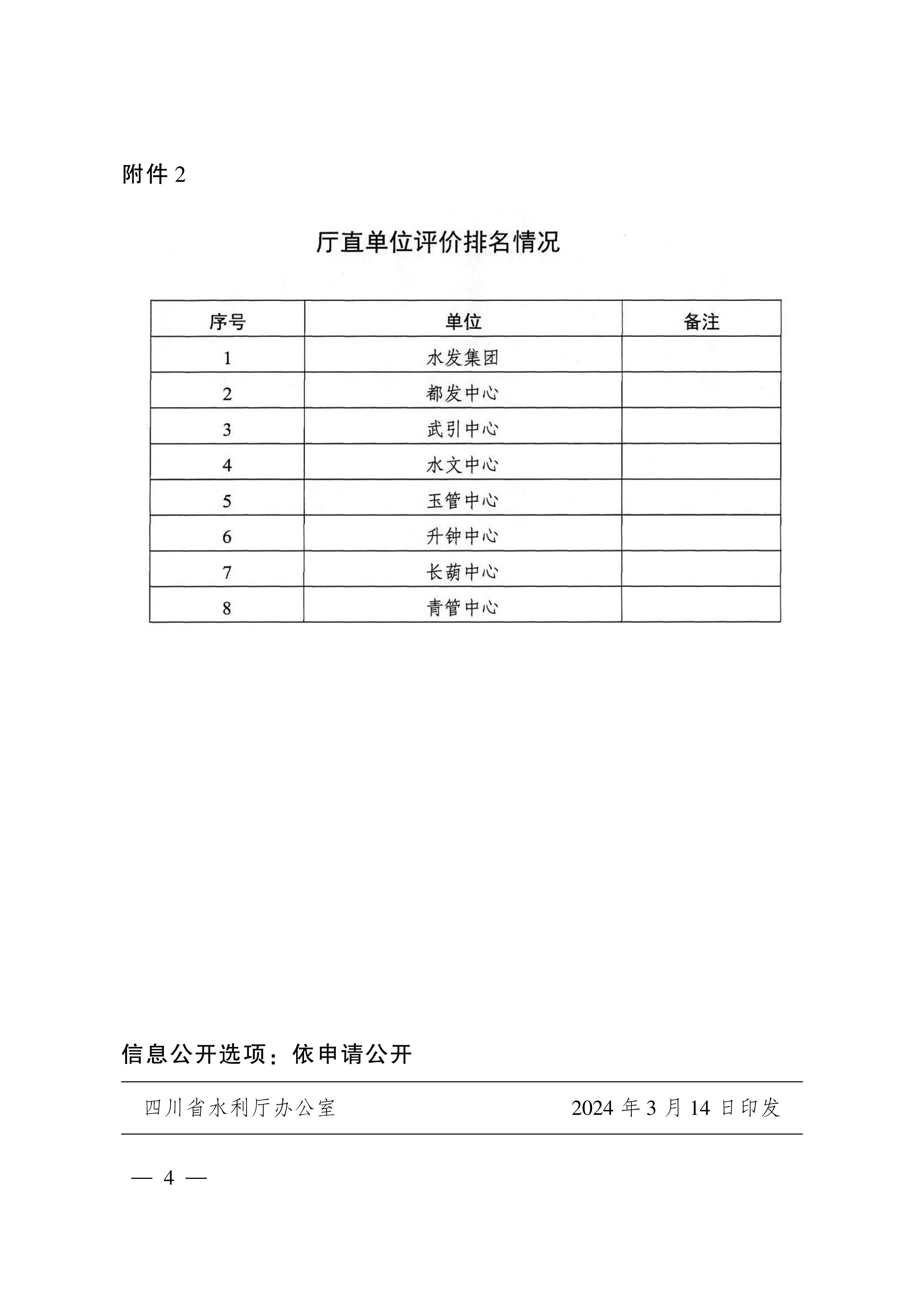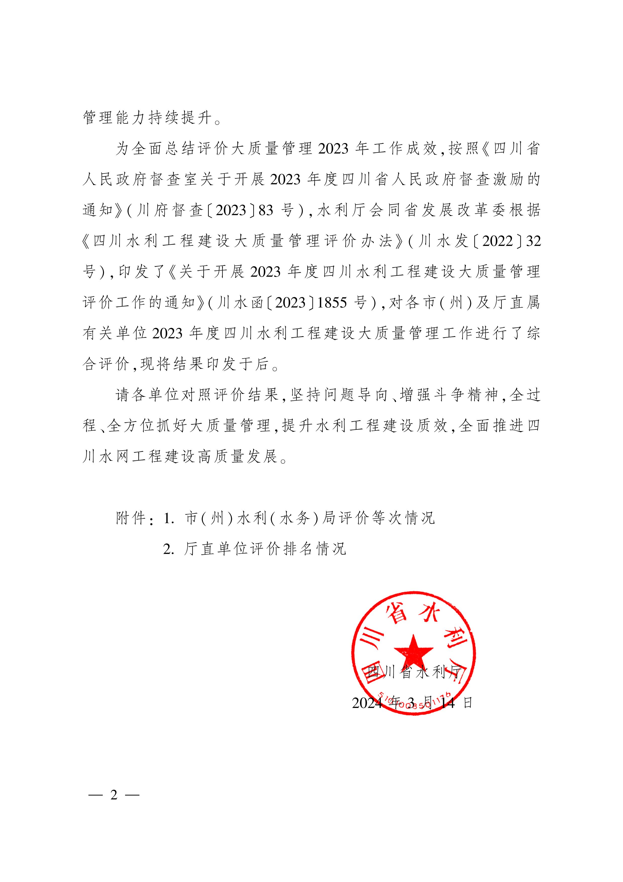 2024年3月14日,水利廳印發(fā)了2023年度四川水利工程建設(shè)大質(zhì)量管理評(píng)價(jià)結(jié)果,四川省水發(fā)集團(tuán)在2023年度四川水利工程建設(shè)大質(zhì)量管理評(píng)價(jià)結(jié)果中成功榮獲廳直單位評(píng)價(jià)排名第一名。