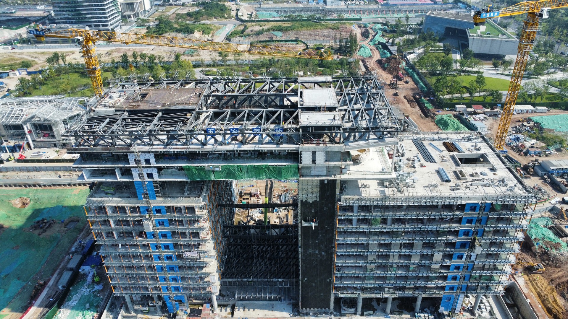 近日,四川水發科創中心建設項目鋼結構層最后一倉樓板混凝土完成澆筑,標志著工程主體結構提前達成全面封頂,建設施工將全面轉入裝飾裝修和機電設備安裝等工作。