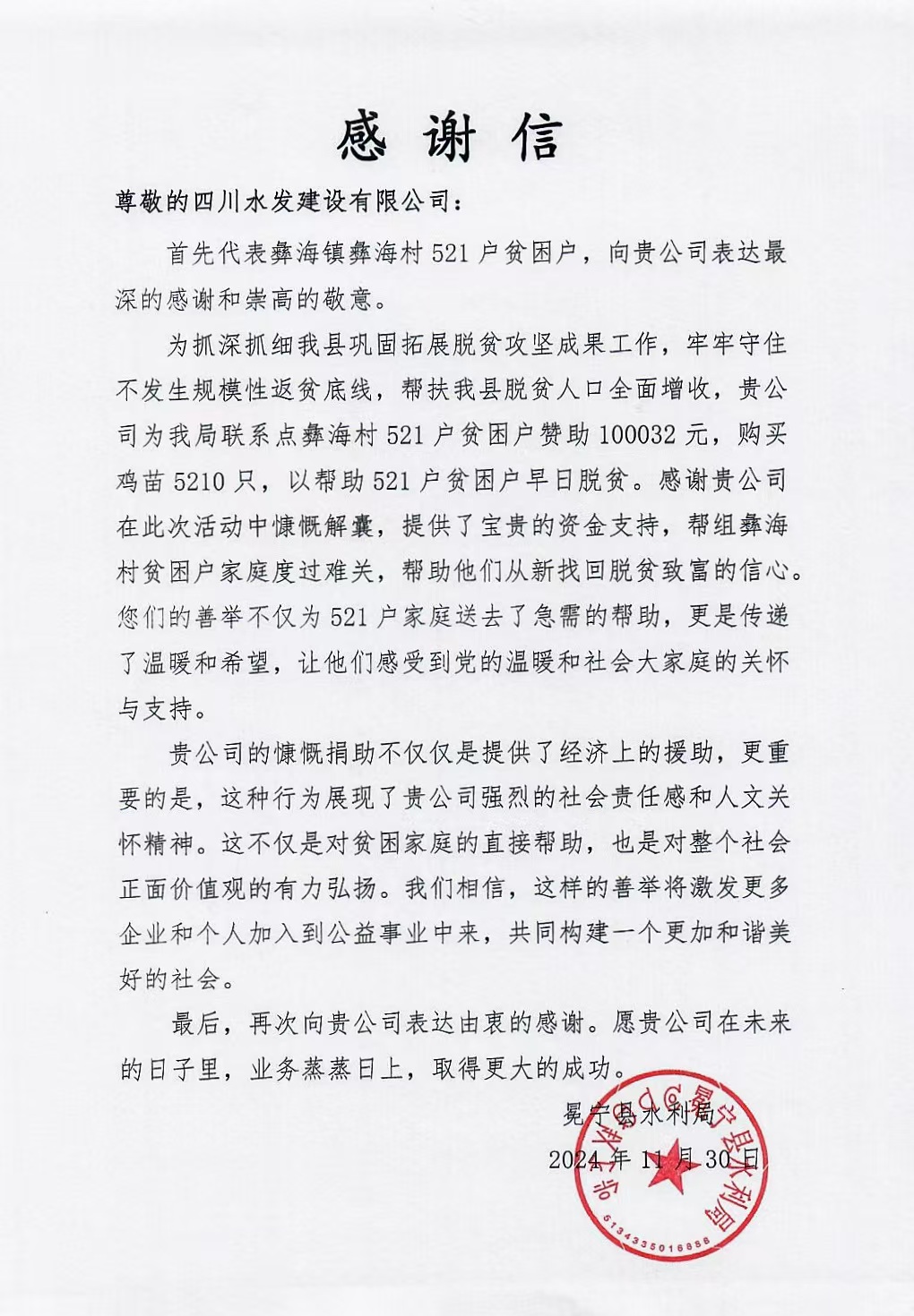 近日,建設(shè)公司收到了來自涼山州冕寧縣水利局的感謝信,涼山州冕寧縣水利局對(duì)建設(shè)公司在冕寧縣彝海鎮(zhèn)彝海村開展的系列幫扶舉措表示感謝。